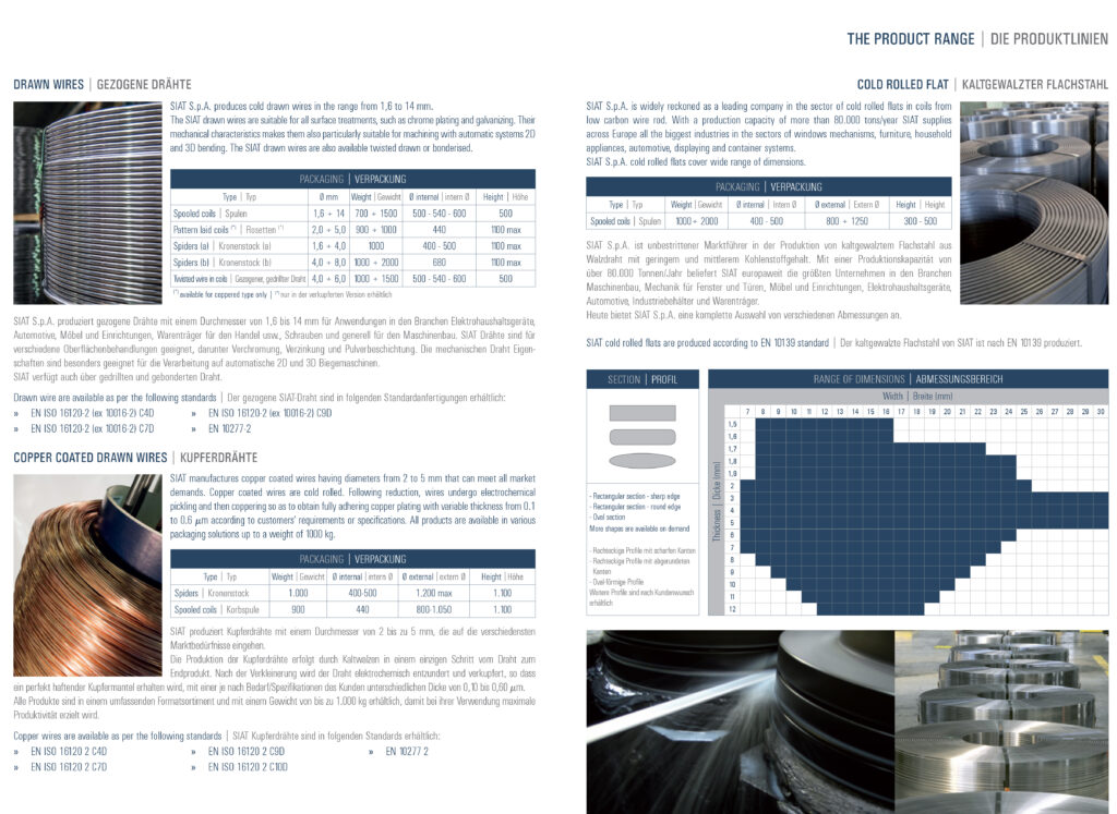 SIAT är en av Europas ledande producenter av dragen, plattvalsad och kopparbelagd tråd. Material är olika typer av lågkolhaltiga kolstål. Verksamheten startade på 1970-talet och är en del av Pittini Group, som producerar stål med en årlig kapacitet på ca 3 miljoner ton. Produktionskapaciteten hos SIAT är 80000 ton/år plattvalsad tråd och 40000 ton/år dragen tråd och man innehar certifiering enligt ISO 9001:2008.