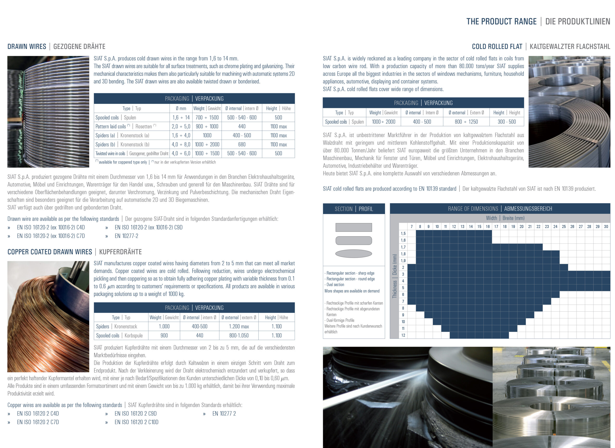 Produktprogrammet består av dragen, plattvalsad och kopparbelagd tråd:
